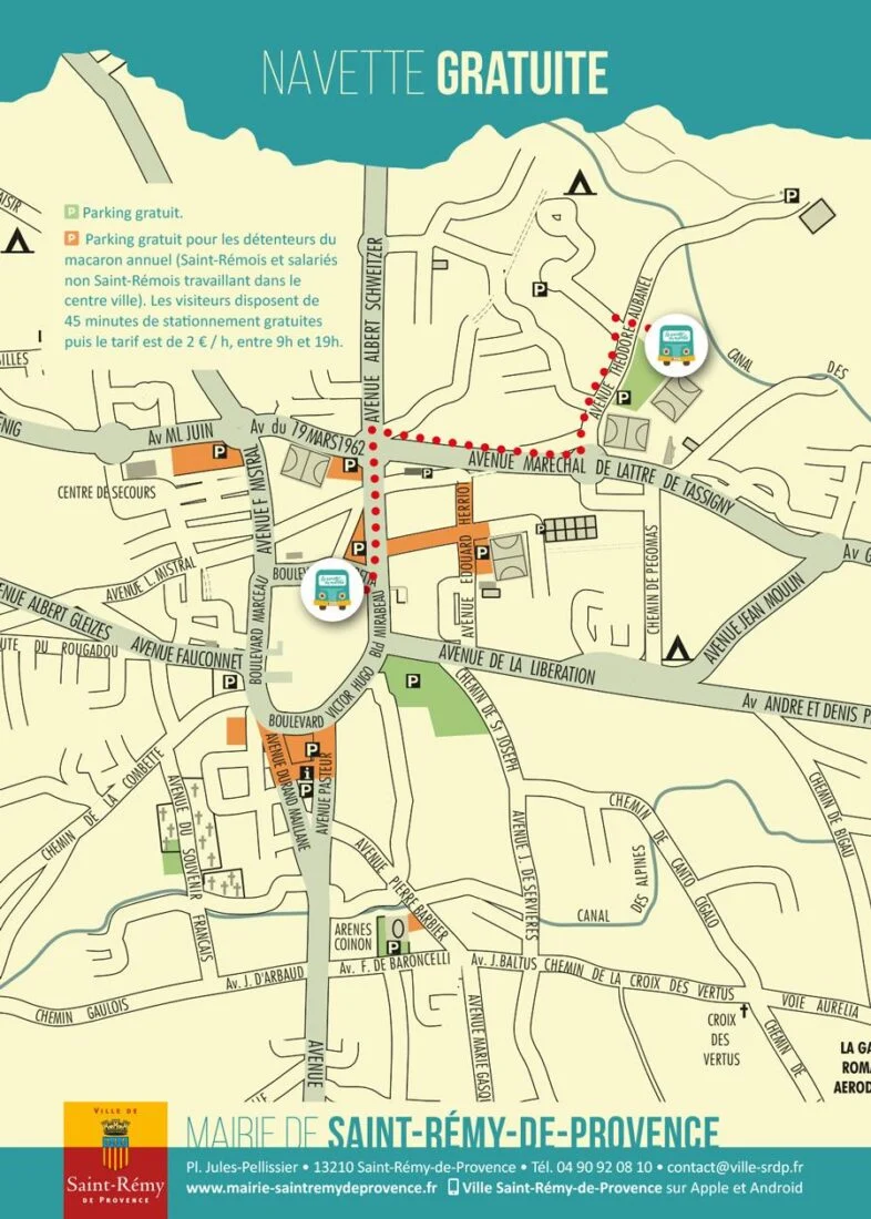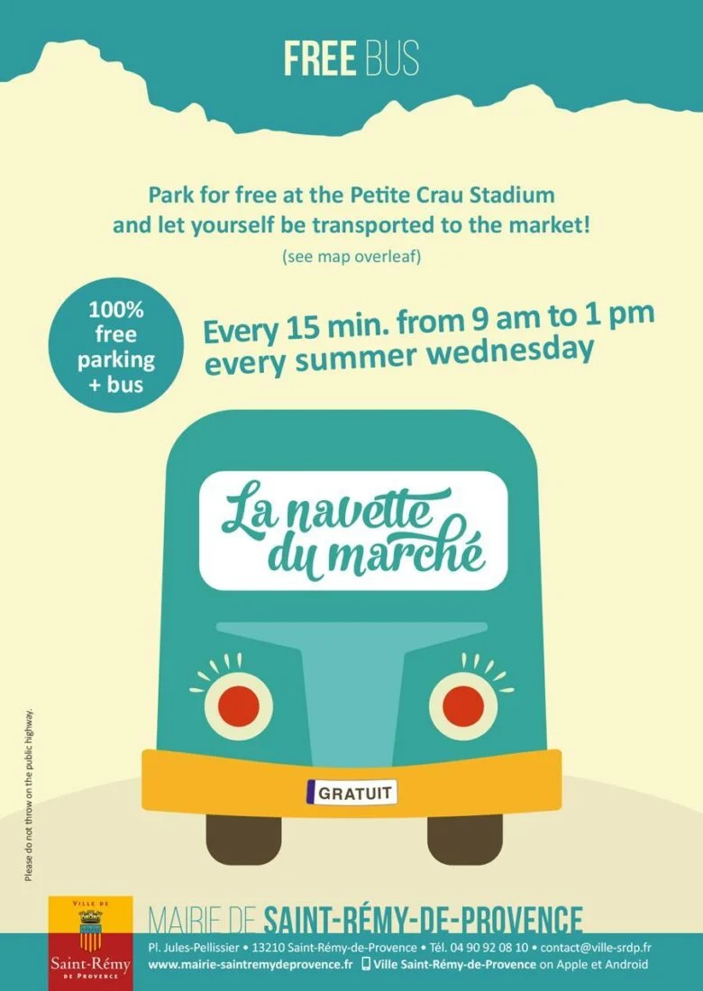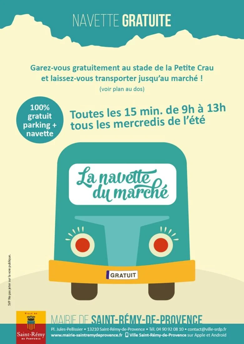 Tous l’été, la ville de Saint-Rémy-de-Provence fait fonctionner un service gratuit de navette, reliant chaque mercredi, de 9h à 13h, et dans les deux sens, le parking du stade de la Petite Crau au centre ancien.